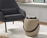 Features a space-conscious round shape with a wood handle detail that is great for moving the footstool