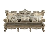 With luxurious styling and comfort with pocket coil seat cushions, the Ranita sofa is grand in looks and feel, with a high wrap around back with oversized carved back detail. This attention to detail in the solid wood ornate and pierced carving surrounds a tight back and lose seat back cushions consisting of pillows. The arms are gracefully rolled with and have nicely shaped face arm posts set upon skillfully carved cabriole legs and supported by a complimenting apron. The plush fabric is tailored to follow the shapes of the wood accents and finished off with Nailhead trim.