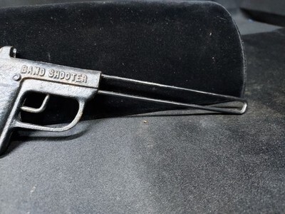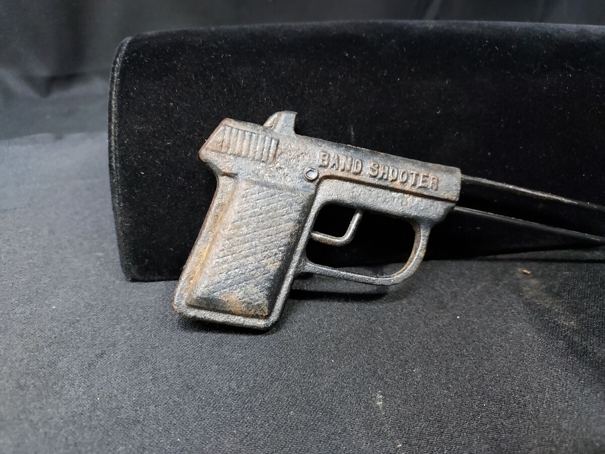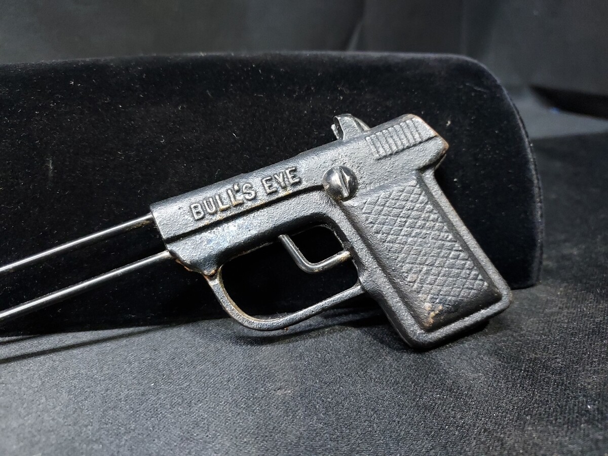 - Rare 1930s Bull's Eye Cast Iron Rubber Band Pistol Shooter Toy, Grey Casting Co.