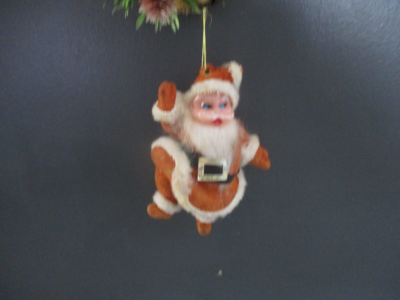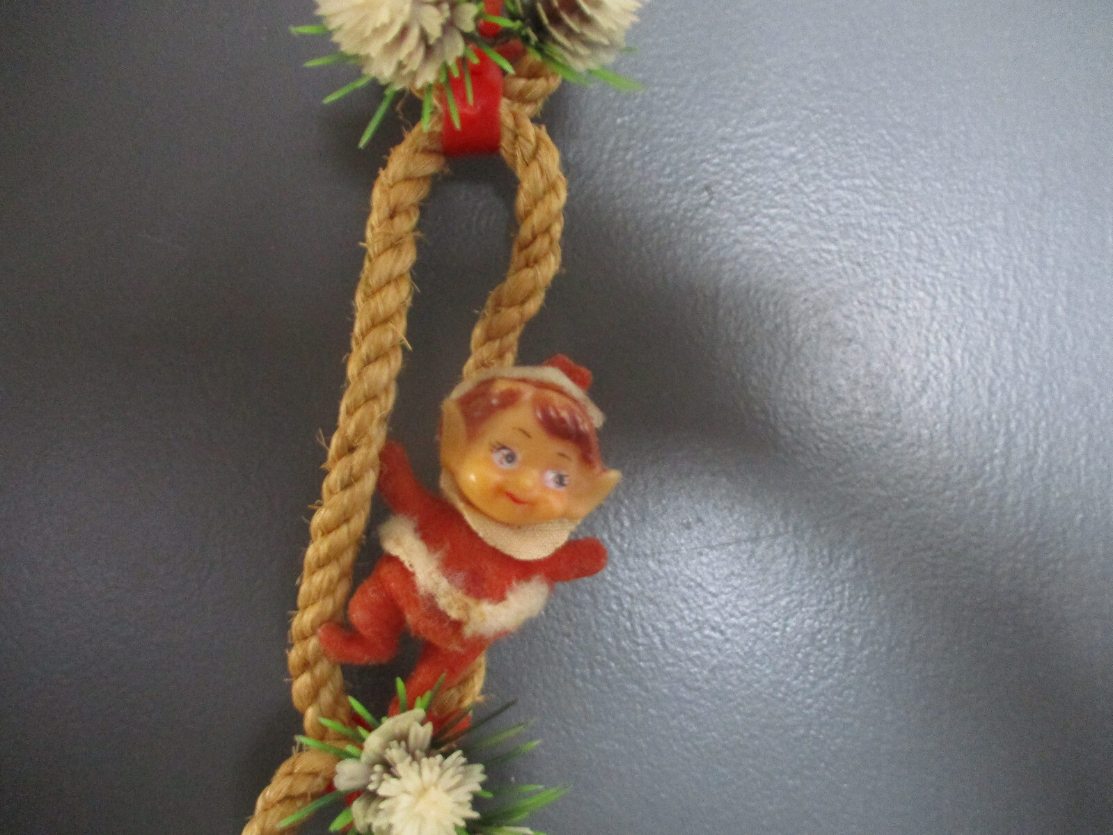 - RARE ANT. XMAS HANGING DECORATIVE PLASTIC FACE ELVES & SANTA ON ROPE 2' FLOCKING