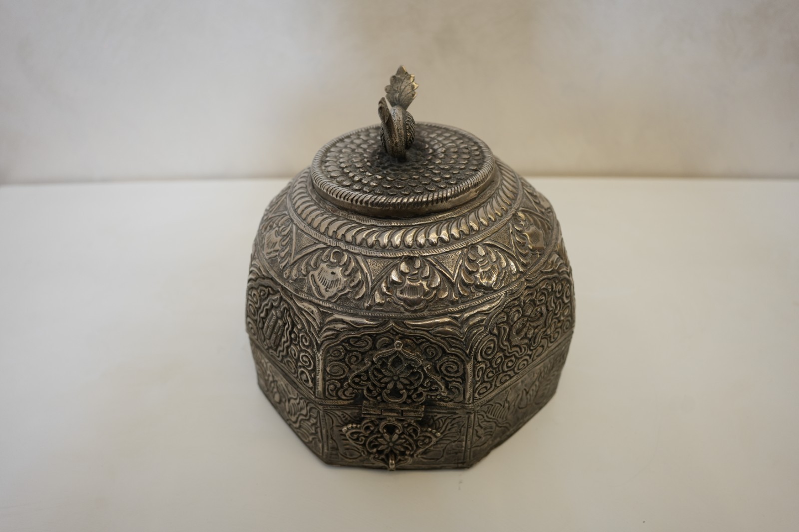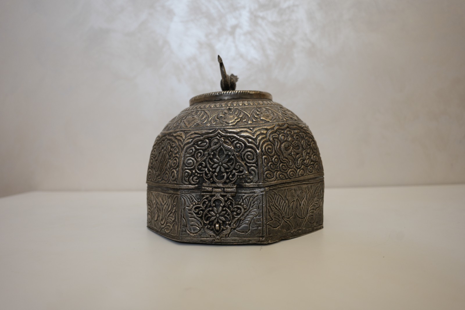 Elevate your collection with this exquisitely detailed vintage Moorish decorative box, featuring intricate embossed patterns and traditional motifs. The box is made of silver-toned / brass alloy with a beautiful aged patina, giving it a classic antique look.