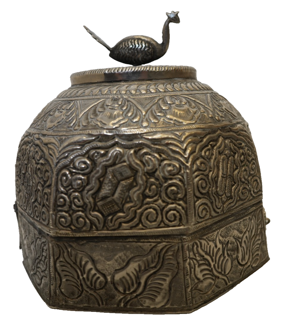 The highlight of this piece is the peacock finial on the lid, a symbol of beauty and grace in many cultures. The body of the box is adorned with floral and geometric designs, as well as bird motifs on the lower section, suggesting skilled craftsmanship from Islamic Moorish culture.