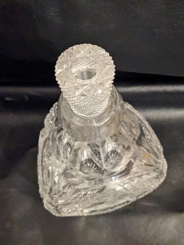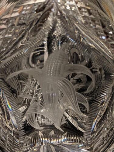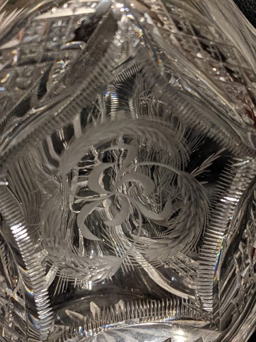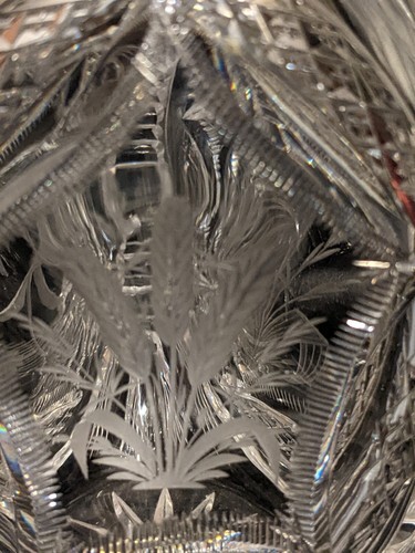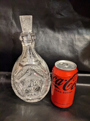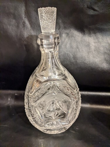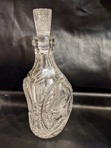 In vendita e un raro whisky di decanter con mozzy di vetro taglio brillante ABP Libbey con mais inciso, grano e tappo. Il tappo ha un chip. Vedi l'ultima foto.