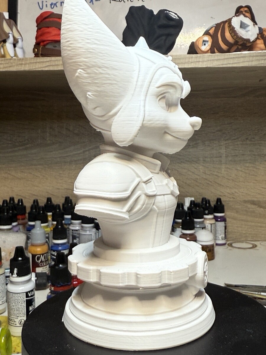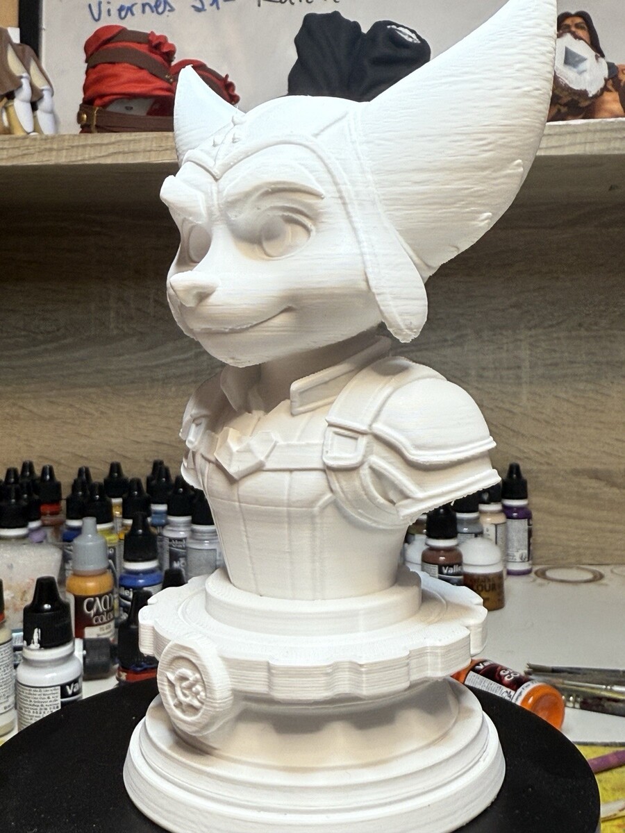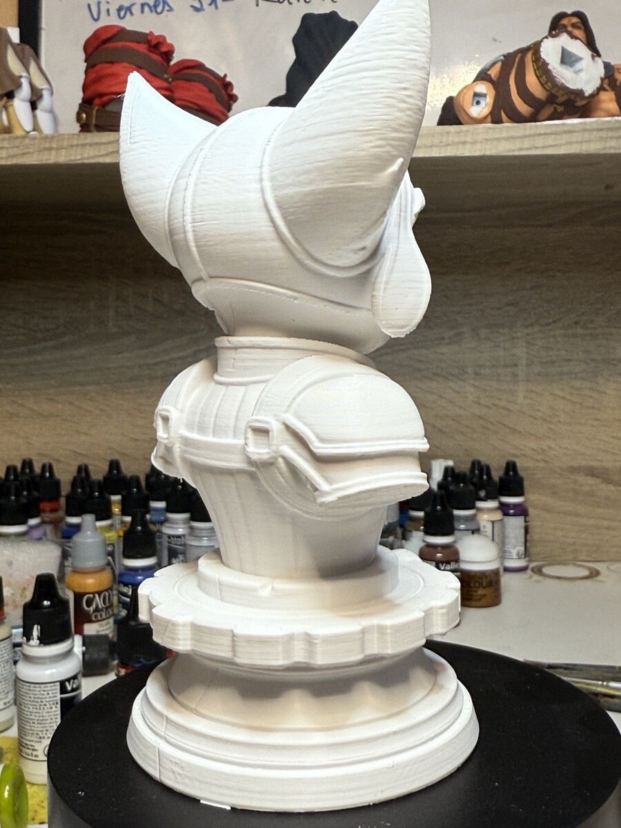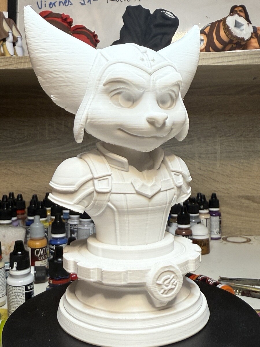 This is a 14 cm unpainted 3D printed bust of Ratchet, created as a fan-made tribute for collectors, painters, and fans of the Ratchet Clank universe.