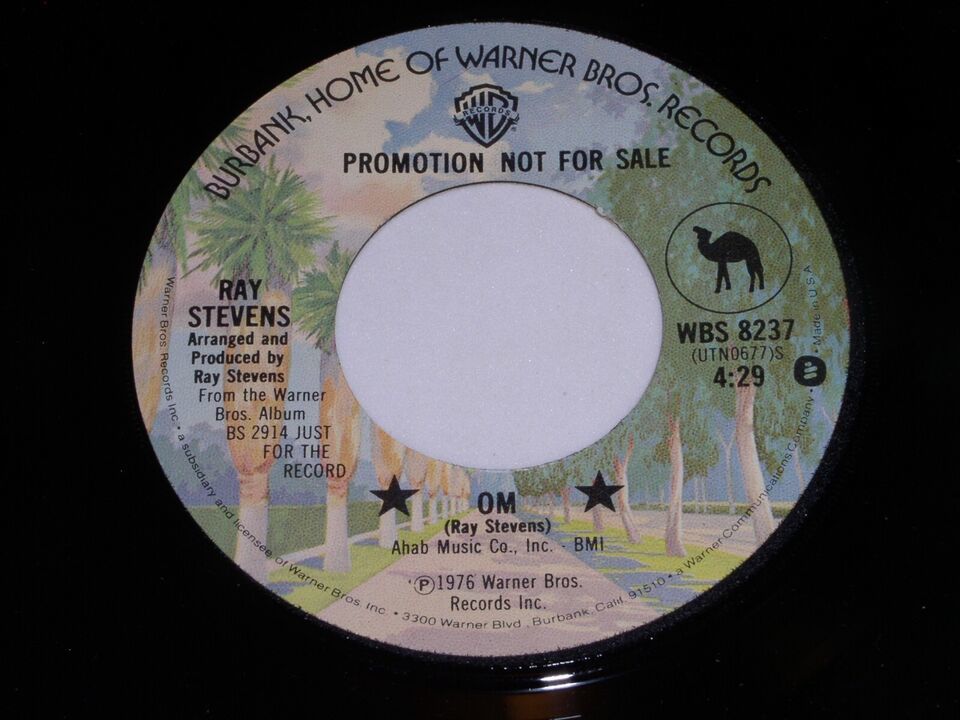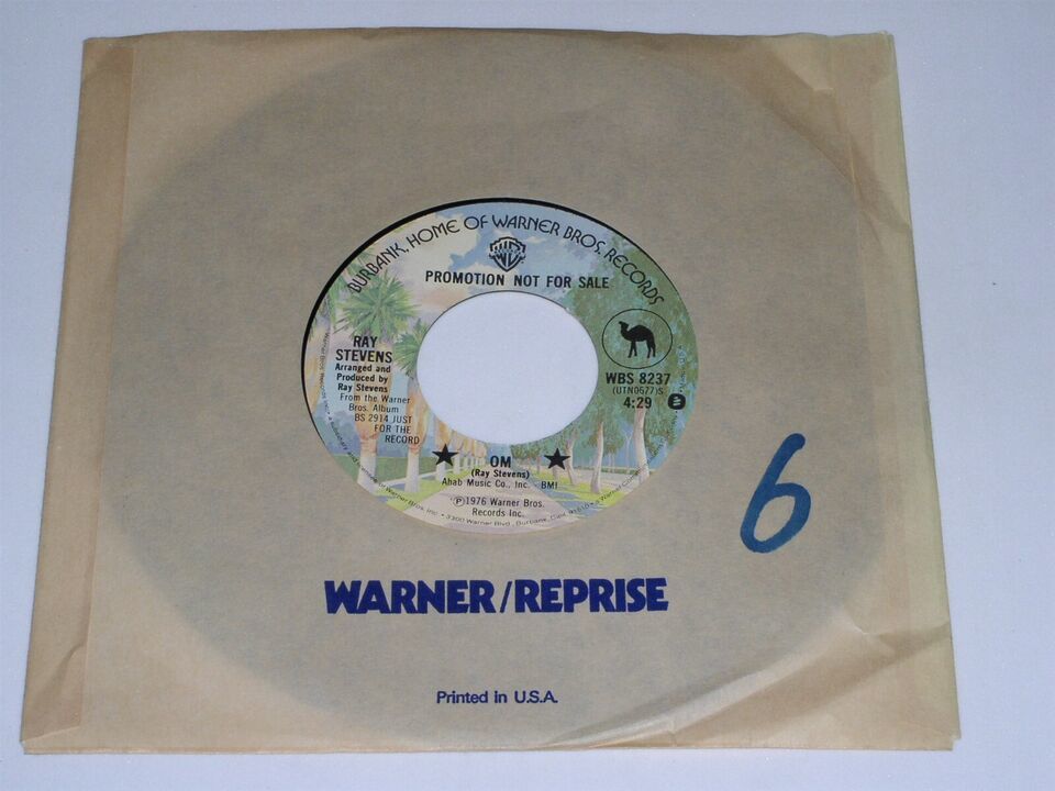 This is a vintage promotional 45 rpm phonograph record by Ray Stevens entitled, "OM". Flipside: "Honky Tonk Waltz". Record label Warner Bros. WBS 8237. Comes with its original Warner/Reprise label paper sleeve as shown.