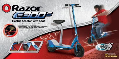 Product description: Features: Stylish padded seat for a comfortable ride Super-sized deck and frame for riders of almost all sizes High-performance, quiet chain-drive motor for speeds up to 15 mph Twist-grip acceleration control Hand-operated rear brake Folding handlebar mechanism for easy storage and transport Extra-wide 10" pneumatic front and rear tires for smooth ride Includes two 12-volt sealed lead acid batteries, battery charger and tools Up to 45 minutes of continuous riding per charge Battery charge time of 8 hours Maximum rider weight: 220 pounds Safety equipment such as helmet, elbow pads and knee pads is recommended Measures 41"L x 17"W x 42"H