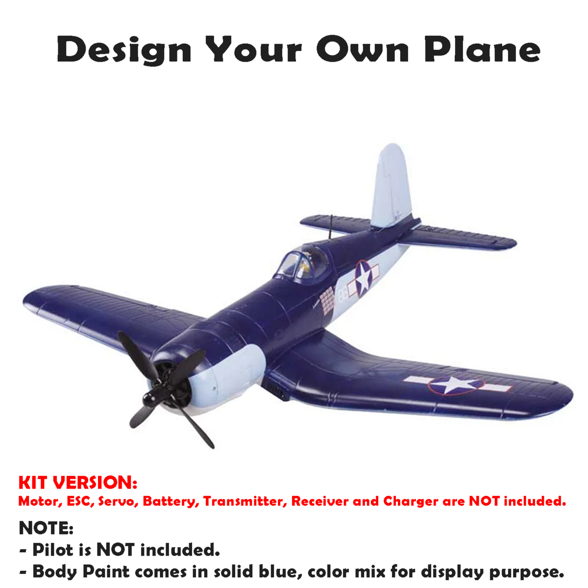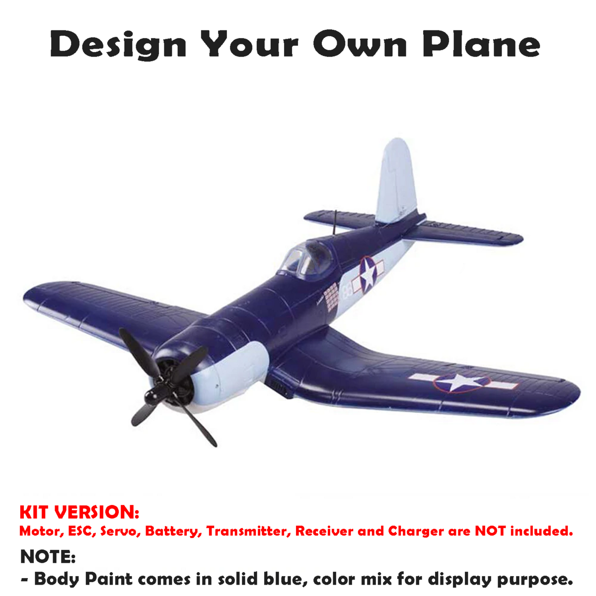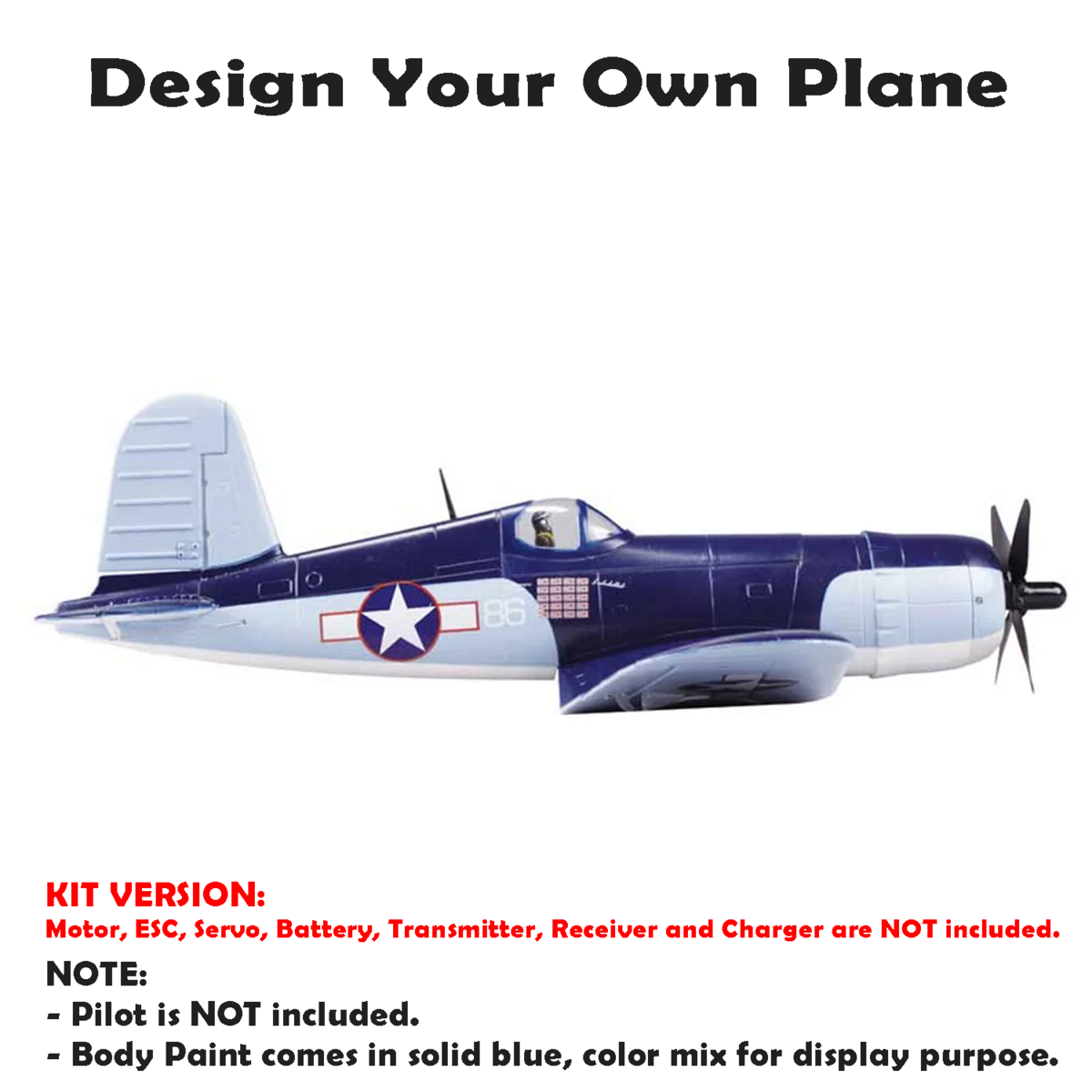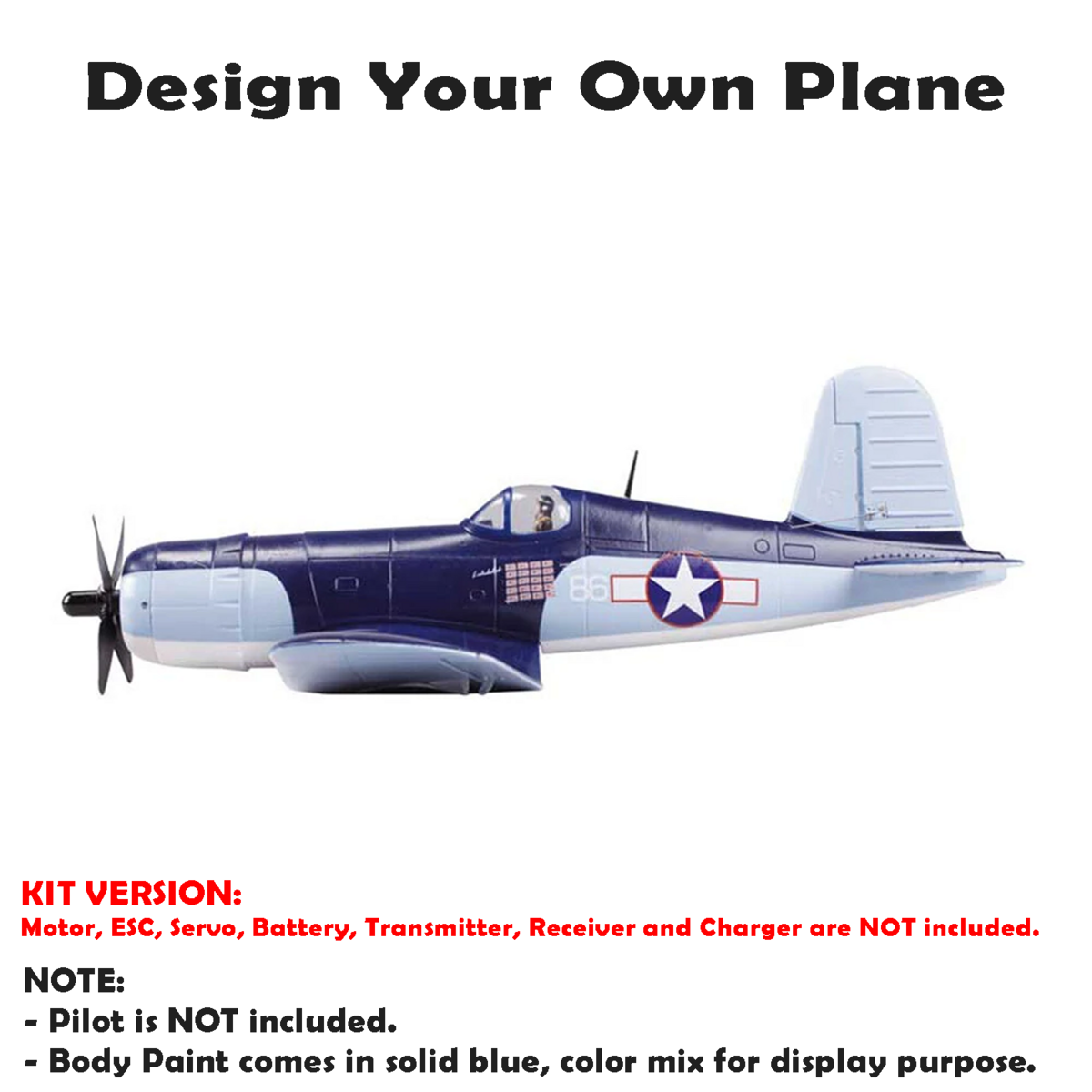 This plane is a KIT Version and does not come with any Motor, ESC, Servo, Transmitter, Receiver, Battery, Charger.