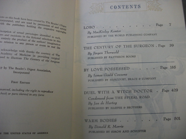 Includes: Lobo by MacKinlay Kantor illustrated by Robert Meyers illustrated by Irwin Smith; The Century of the Surgeon by Jurgen Torwald; By Love Possessed by James Gould Cozzens illustration by Sevan Dohaner; Dual with a Witch Doctor by Jan De Hartog illustrations by Noel Sickles; Warm Bodies by Donald R. Morris illustrations by Harry Beckhoff.