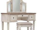 Elevating the art of traditional cottage styling, this 3-piece vanity set is your dream bedroom retreat realized. Its antiqued two-tone aesthetic blends a chipped white with a distressed wood finished top for added charm. Framed drawer fronts and a plushly upholstered stool add refinement, while the tri-panel mirror lends a classic touch.Additional Dimensions Bench: 0" Side drawer interior (lined) (2): 0" Center drawer interior (lined): 0" Product Features Includes vanity, three-panel mirror and upholstered stool Made of veneers, wood and engineered wood, with cast resin components Stool with polyester upholstery Antiqued two-tone finish 3 smooth-gliding drawers with dovetail construction Dark bronze-tone finished metal hardware Realyn - White / Brown / Beige - Vanity/Mirror/Stool (Set of 3)54.0"W x 18.0"D x 59.38"H - 1.0 lb
