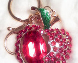 Red Apple Rhinestone Key ring. generously covered in red stones. With a green leaf to add a bit of decorative realism.