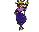 Features a redheaded Queen wearing a deep purple gown and a gold crown on her head. In her hand she holds a gold scepter.