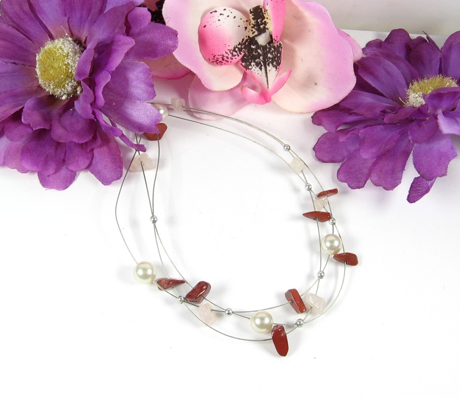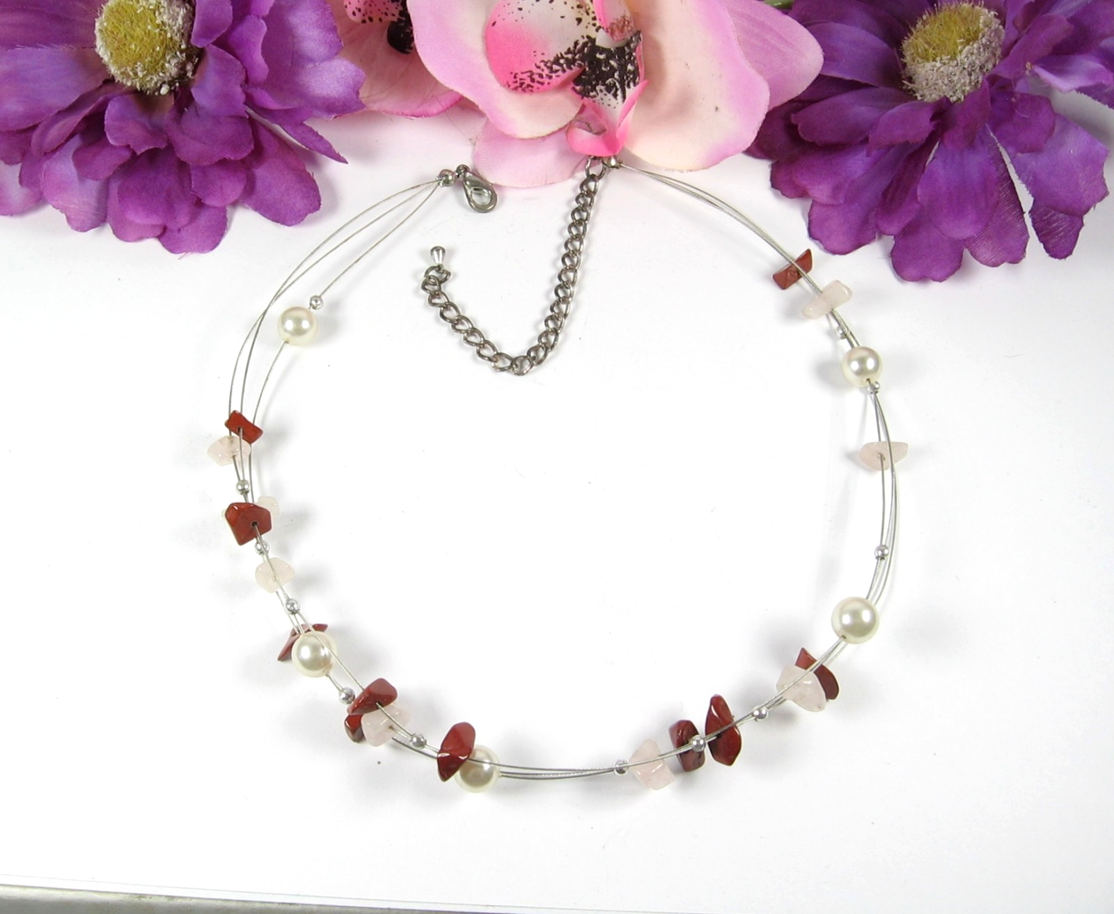 RED JASPER QUARTZ STONE Vintage FLOAT NECKLACE Faux Pearl Floating 3 Strands