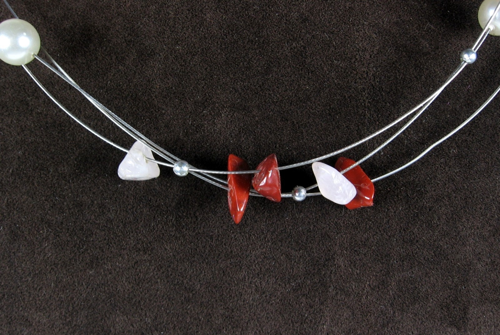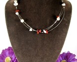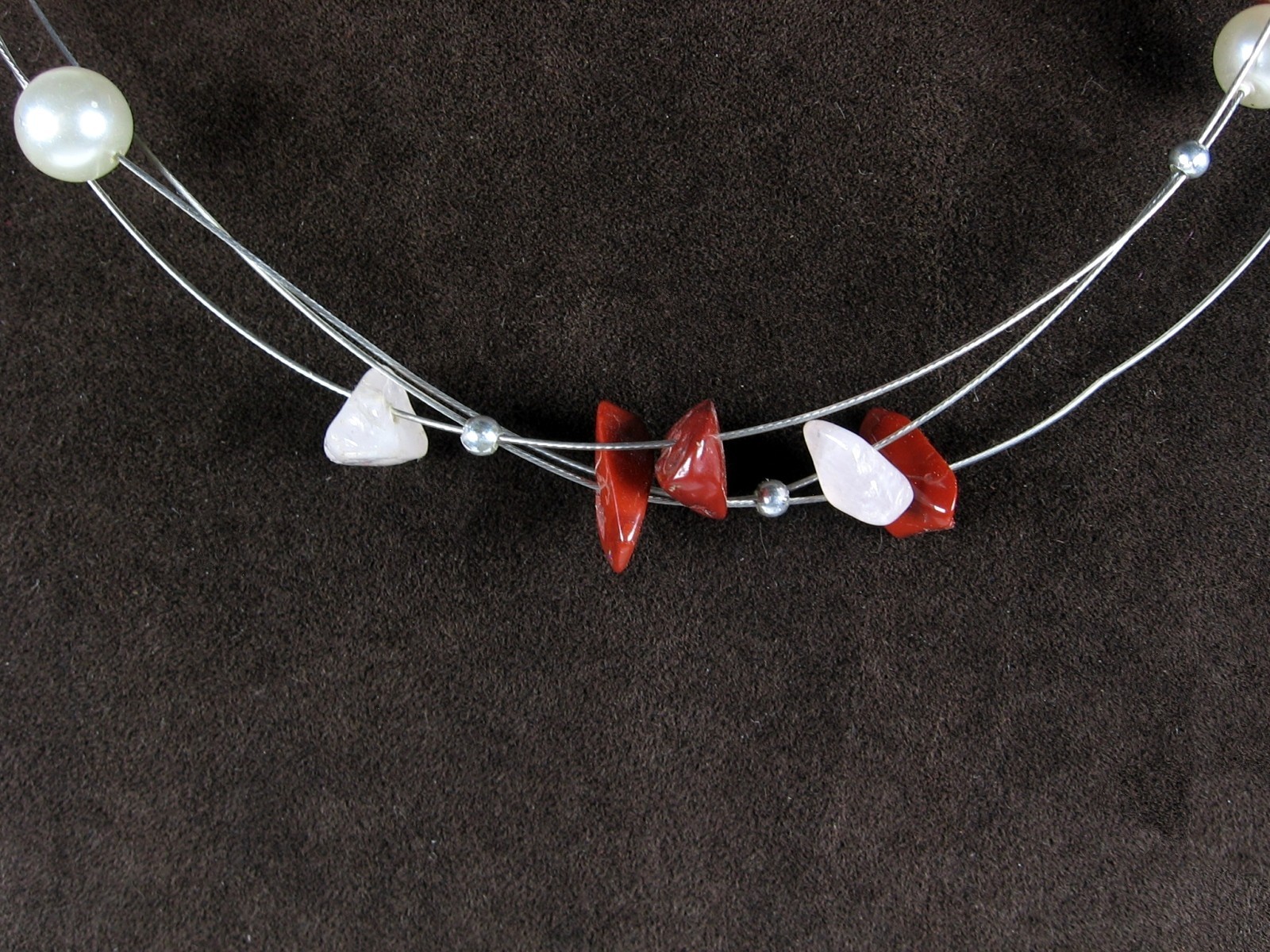 - RED JASPER & QUARTZ STONE Vintage FLOAT NECKLACE Faux Pearl Floating 3 Strands