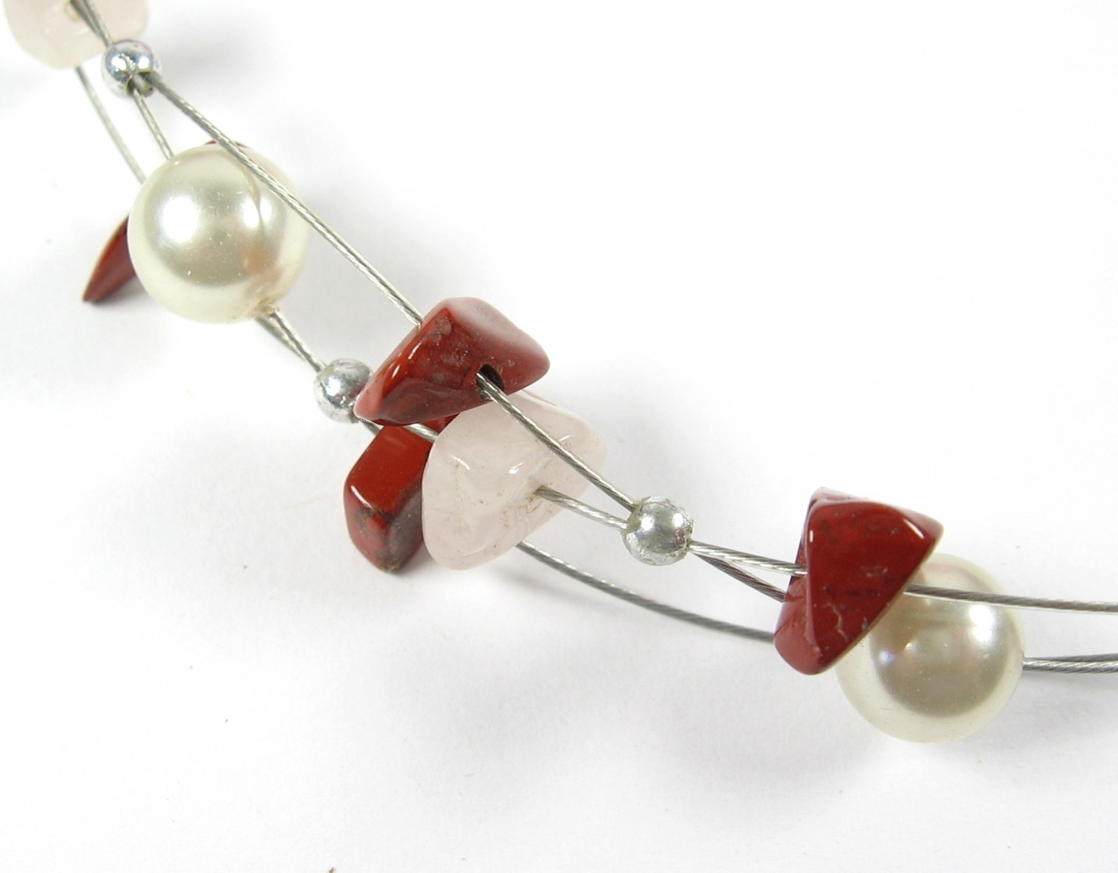 There are chips of red jasper as well as quartz; some have the pink tint of rose quartz, as well as glass faux pearl beads and small metal silvertone beads.