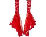 Red Lace Arms with Lace edged Netting. Like arm warmers. Ends are Open. Top end has elastic. Bottom Ends are different lengths to give it a tapered look. Seam edges don't line up straight. May have some long threads that need trimmed. Arms look small. The lace is a different shade of red on the arm sleeves compared to the netting. Will have some wrinkles creases from being folded in package. Not a licensed Beetlejuice Accessory.