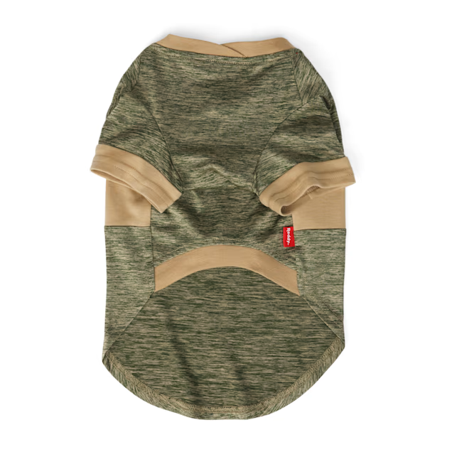 Add an eco-friendly touch to your pal's wardrobe with the Olive and Tan Spacedyde Tee from Reddy. Recycled materials are used to craft this ultra-soft style your pet will love.Plus, it's machine washable and features a D-ring portal for easy lead access!