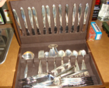 Excellent condition. No monogram. Light oxidation. Lengths are approximate. The carving set, ladles, serving spoons and most other pieces appear to have little to no use. I believe the Reed and Barton wooden storage chest is mahogany, but am not sure. I do not have a scale, so you will have to do your own research for weight. The knives, carving set, and pie servers have stainless steel blades. Eight of the dinner knives have been professionally serrated in Germany, and cut like steak knives. See the pics. Shipping includes full insurance. Not counting the hollow handles on the stainless steel blades (26) , I estimate the weight to be about 82 ounces of sterling silver (2551 grams) based on published weights. The pictures of the dinner forks and soup spoons do not show ten units, but there are.