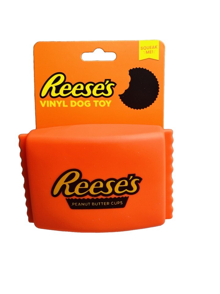 - Reese’s Peanut Butter Cups Plastic Squishy Orange Dog Toy 5x3 Inches APROX