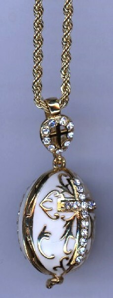 Una bella croce in bianco, progettata da un ciondolo di uova russo reale con collana da 20 pollici