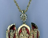 Background is Red, crystal cross, opens with a three piece set of like Madonna and Child in the middle with two sides with Scenes. The opened setup is shown for just one of five pendants, each can be seen just email for more photos. Contact for more. A beautiful Cross in Red, designed from Royal Russian Egg Pendant with Necklace 20 Inches This exquisite and artistically crafted egg pendant necklace brings elegance and sophistication with simple contrasts of color and texture. Its' charm is inspired from Russian royal egg pendants, and it's ready to complete most outfits! Attention Europe and Asia customers please be aware standard postage can take from 7-45 business days to arrive. If you need the item faster please select another mailing option. Please contact us with any questions.