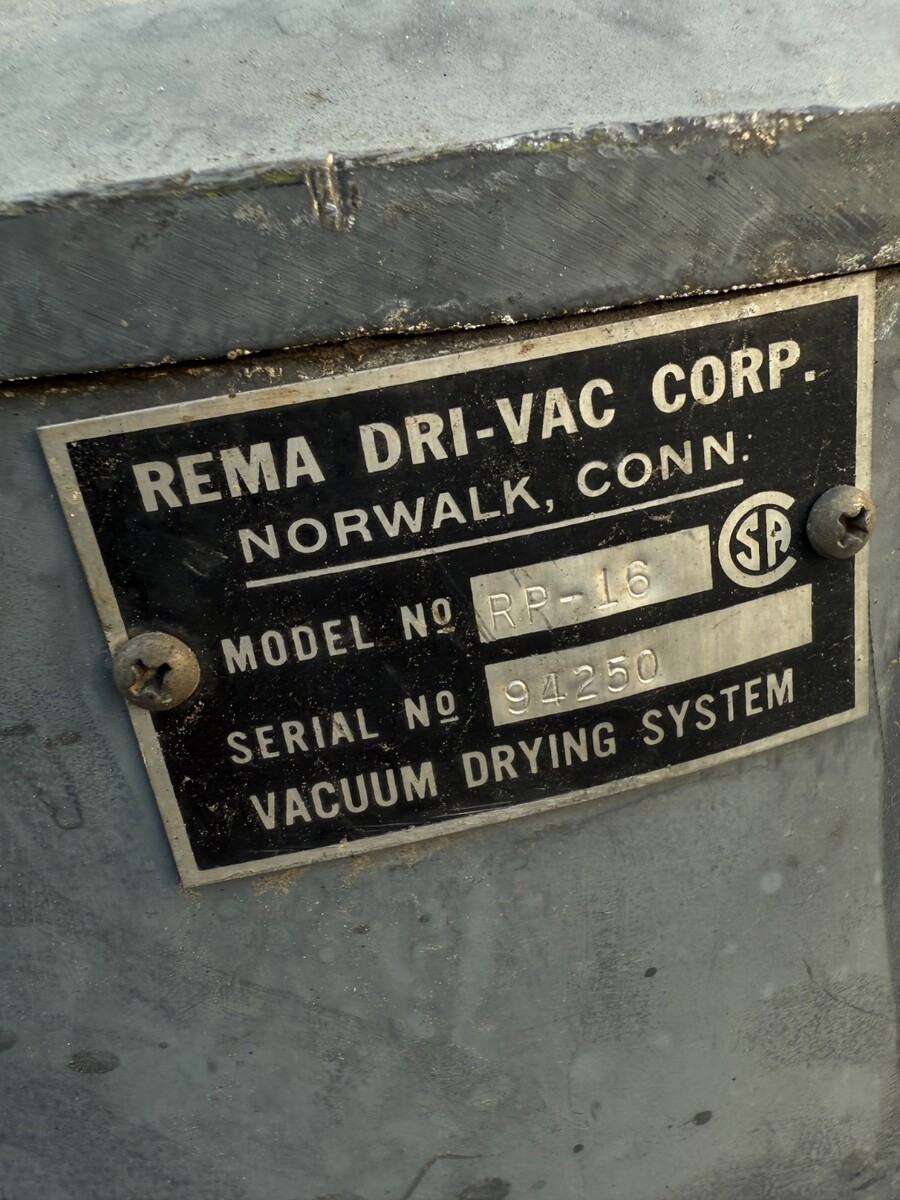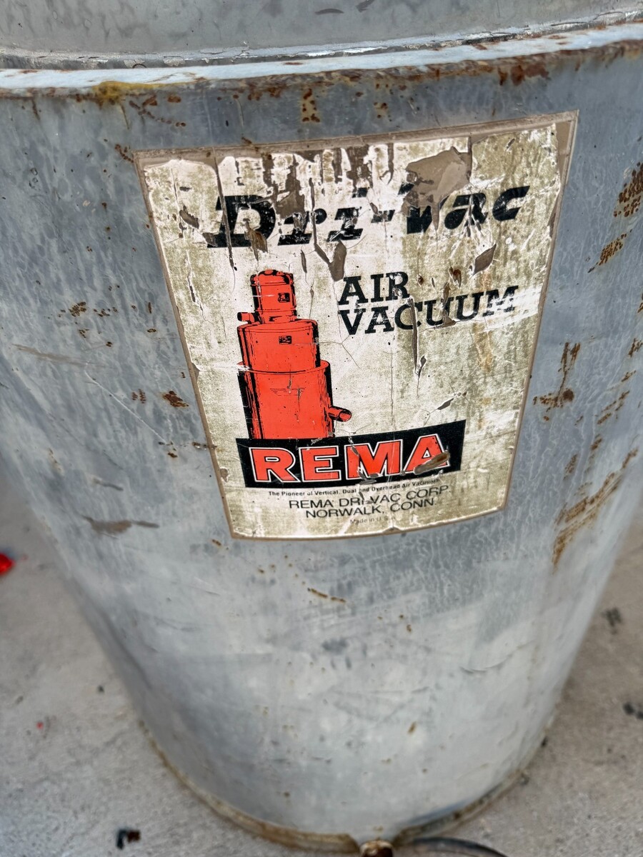 The REMA Dri-Vac Model RP-16 is a heavy-duty vertical air vacuum system commonly used in dry cleaning and laundry settings to serve multiple pressing stations with efficient suction and condensate recovery.