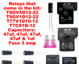 Components that come in the kit: T9GV5D12-22, T9GV1D12-22, T77V1D10-12, T7CS1D-12, 3 amp fuse and Capacitors: 47uf, 47uf, 47uf, 47uf and 1uf