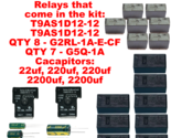 Relays that come in the kit: QTY 2 T9AS1D12-12 QTY 8 G2RL-1A-E-CF, QTY 7 G5Q-1A, Capacitors: 22uf, 220uf, 220uf, 2200uf, 2200uf