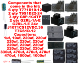 Relays that come in the kit: 6 qty T771D10-12, 2 qty T9S1D22-24, 3 qty G8P-1C4TP, 2 qty G2RL-1A-E, G2RL-1-E 24v, J1071CS12VDC.36,T7CS1D-12, Capacitors: 1uf, 10uf, 220uf, 220uf, 220uf, 220uf, 220uf, 220uf, 220uf, 220uf, 220uf, 220uf, 220uf, 330uf, 470uf, 470uf, 470uf, 470uf, 1000uf, 1000uf