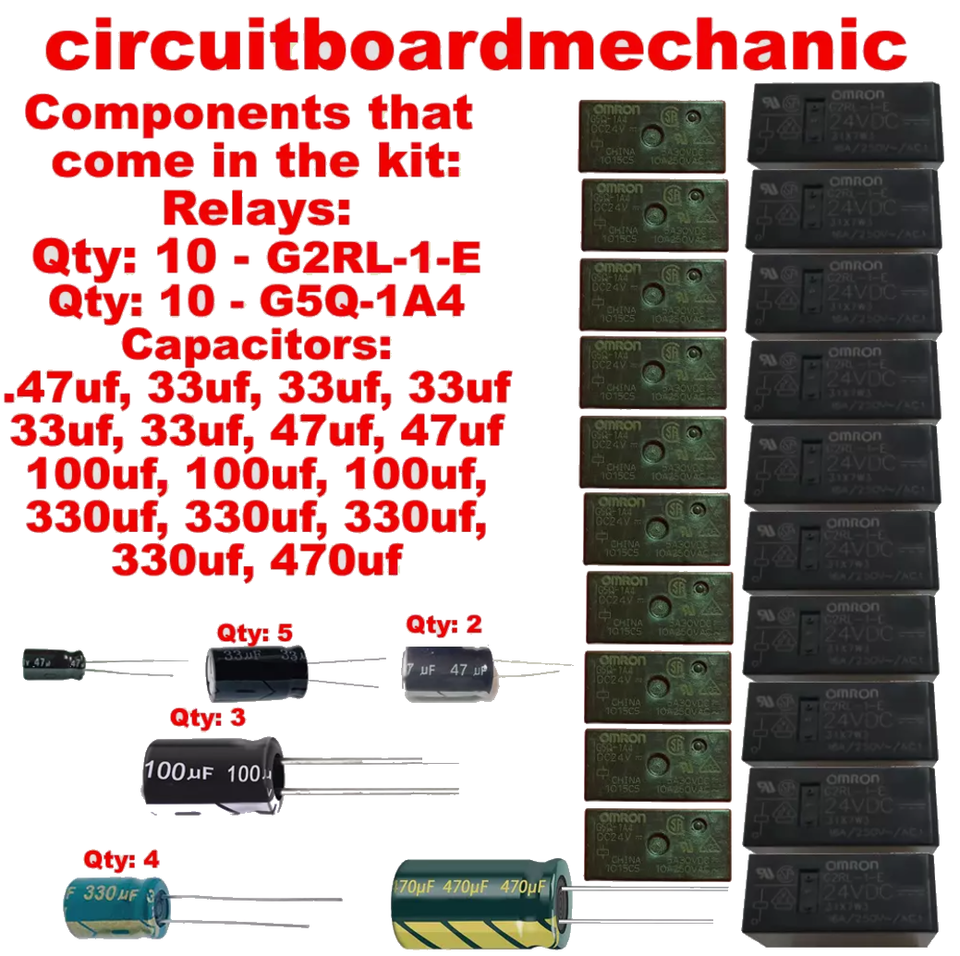 Relays that come in the kit: QTY 10 G2RL-1-E, QTY 10 G5Q-1A4, Capacitors: .47uf, 33uf, 33uf, 33uf, 33uf, 33uf, 47uf, 47uf, 100uf, 100uf, 100uf, 330uf, 330uf, 330uf, 330uf, 470uf