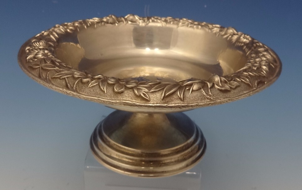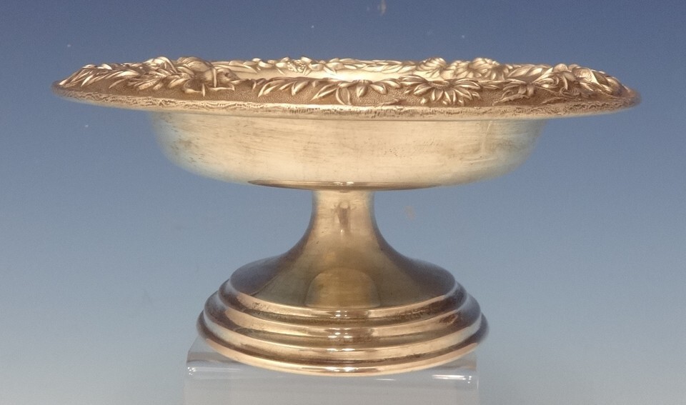 Repousse by Kirk sterling silver raised compote. It is marked #409A and dates from 1925-32. The compote measures 2 3/4" tall, 6 1/4" in diameter, and it weighs 6.3 ozt (not weighted). It is not monogrammed and is in excellent condition.