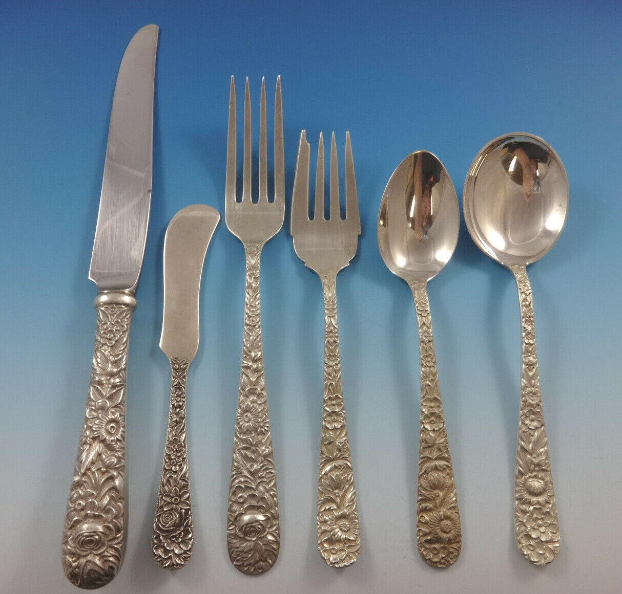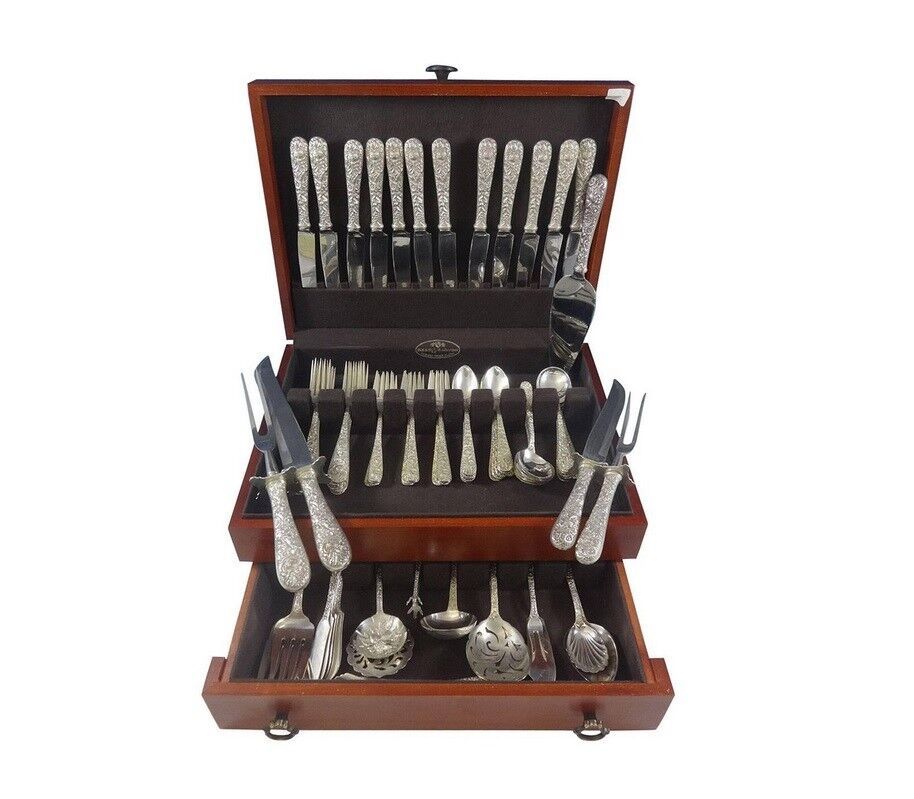 - Repousse by Kirk Sterling Silver Flatware Set For 12 Service 89 Pieces