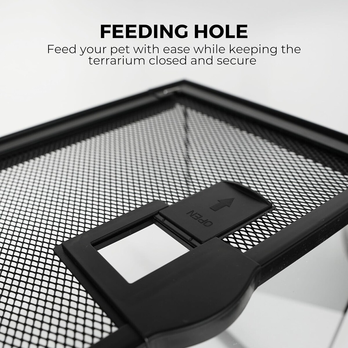 PREMIUM FEATURES: Featuring a top mesh screen and 360-degree viewing, the snake terrarium provides optimal airflow to maintain a healthy habitat. The frame is equipped with two cable slots and supports the use of a heating pad at the base of the tank.