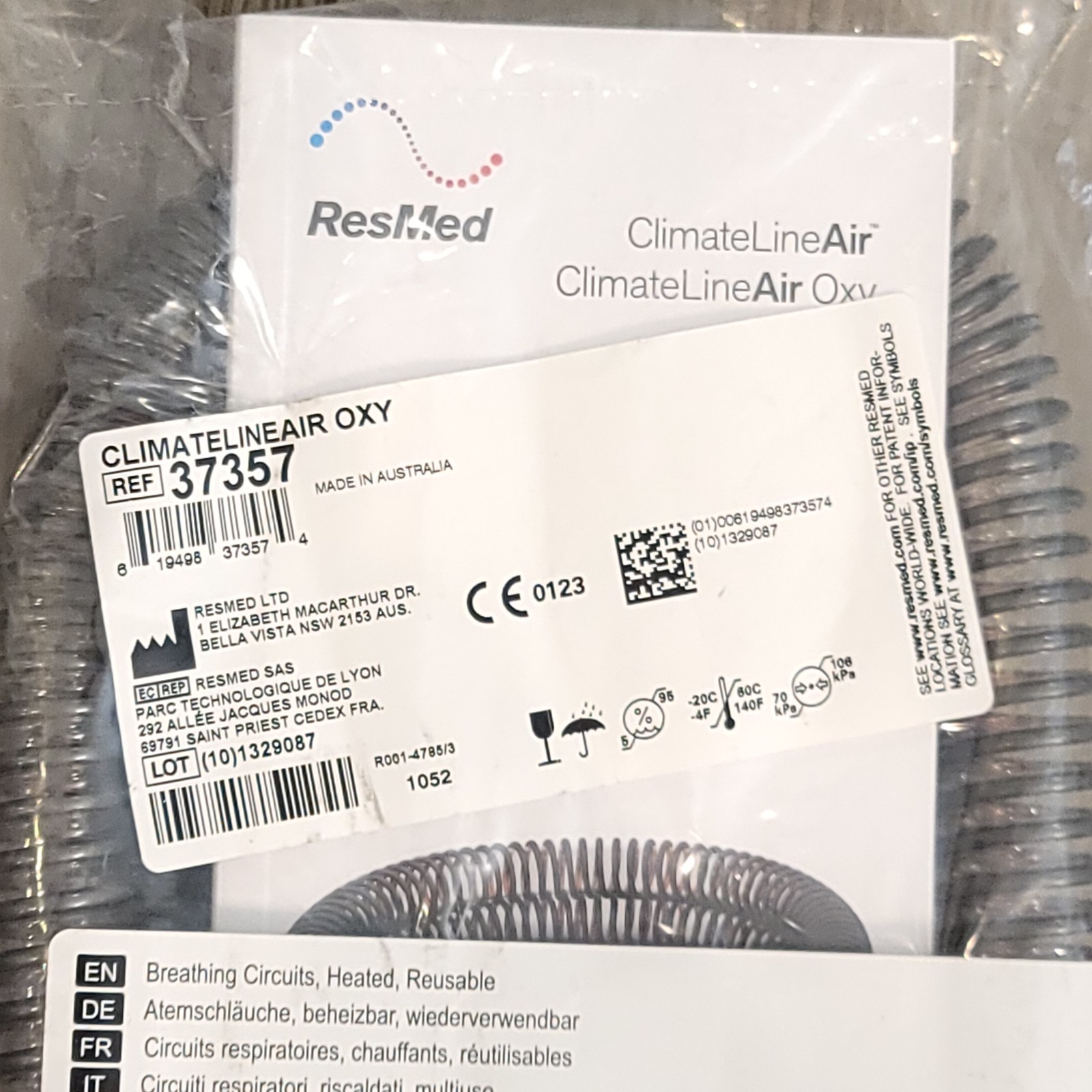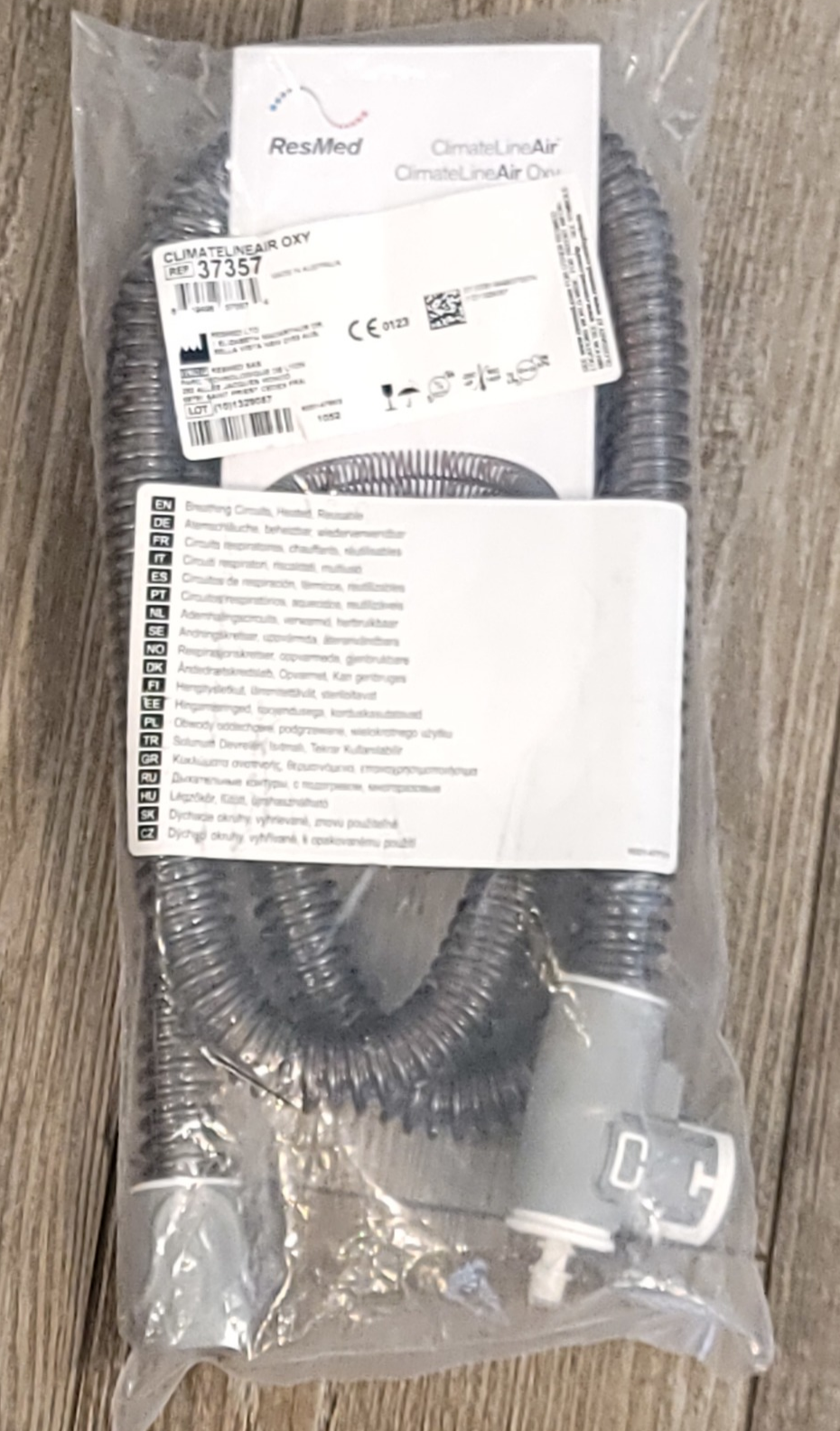 The Res Med Climate Line Air Oxy #37357 Tube Hose is a black hose designed specifically for use with Res Med equipment. It is an OE/OEM part number 37357, which ensures compatibility with the Res Med system. The hose is included as the main item in this listing, and it is designed to provide air and oxygen to the user's device. This Climate Line hose is an essential component for maintaining proper airflow and delivering oxygen effectively in the Res Med system.