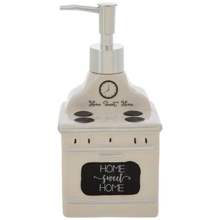 Tie all your kitchen appliances together! Simply fill this Home Sweet Home Oven Soap Dispenser with your favorite soap and keep things clean. This glossy ceramic soap pump is shaped like an oven range with a clock and decorative text. Deck out your space with old-school, farmhouse-style accents like this soap dispenser!
