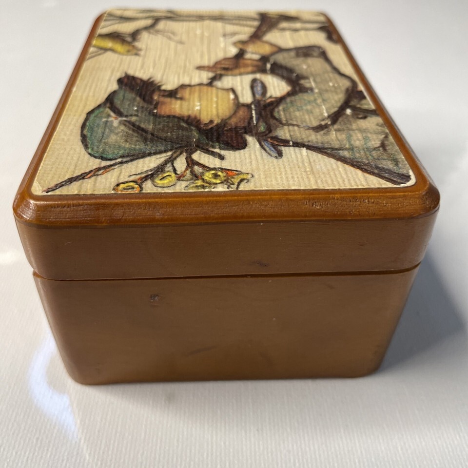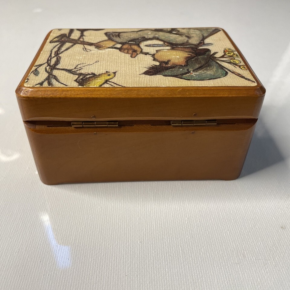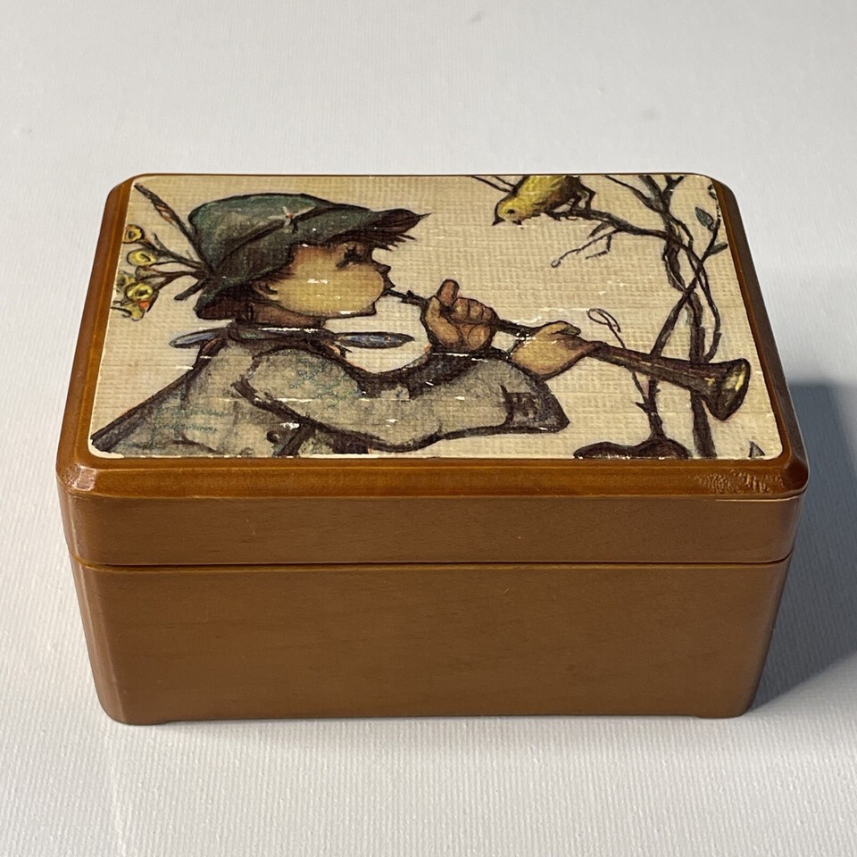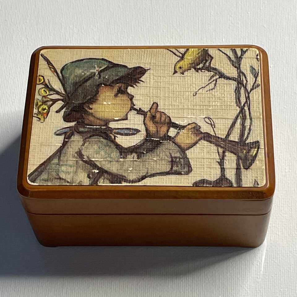- Reuge Swiss Music Box Boy Playing Horn Wood Footed Hinged Lara’s Theme 4”x3”x2”