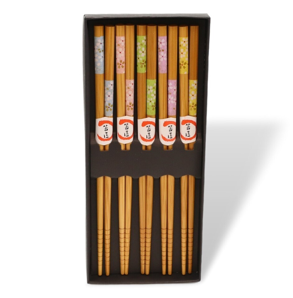 Ebros Reusable Bamboo Colorful Cherry Blossoms Set of 5 Ridged Chopsticks Pairs In Box