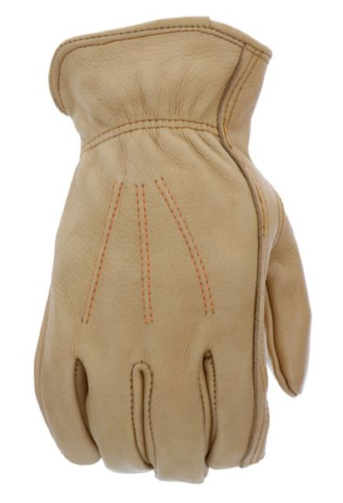 Premium grain cowhide leather Water resistant technology Shirred elastic wrist Gunn cut with keystone thumb