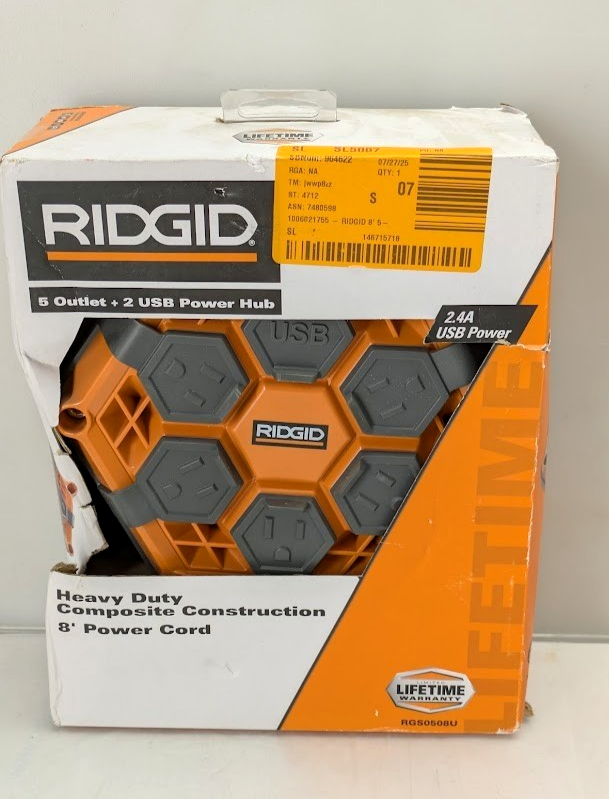 - Ridgid 8 ft. Heavy Duty Cord 5-Outlet 2 USB-A Power Hub Foldable Hook RGS0508U