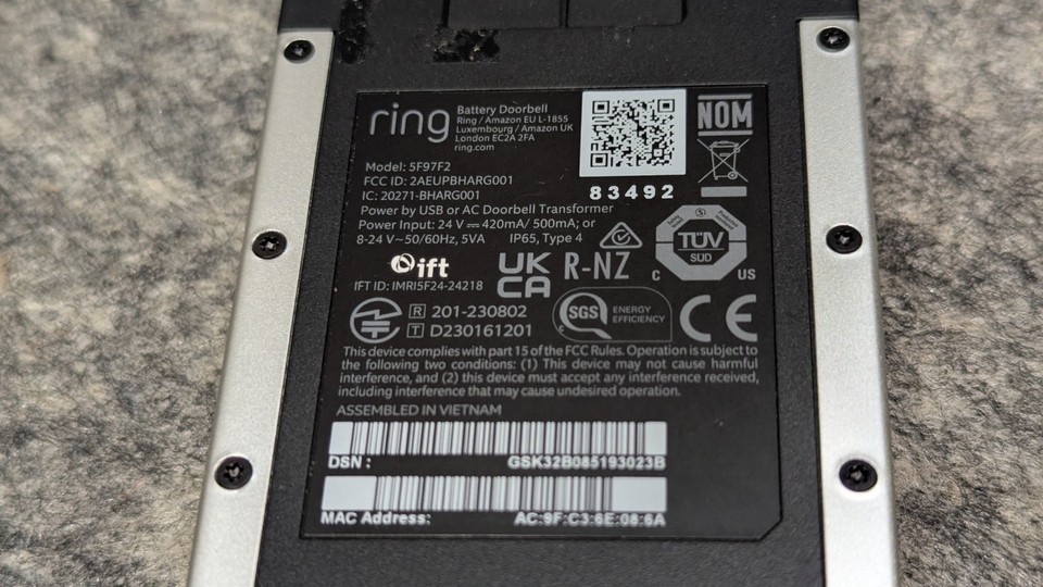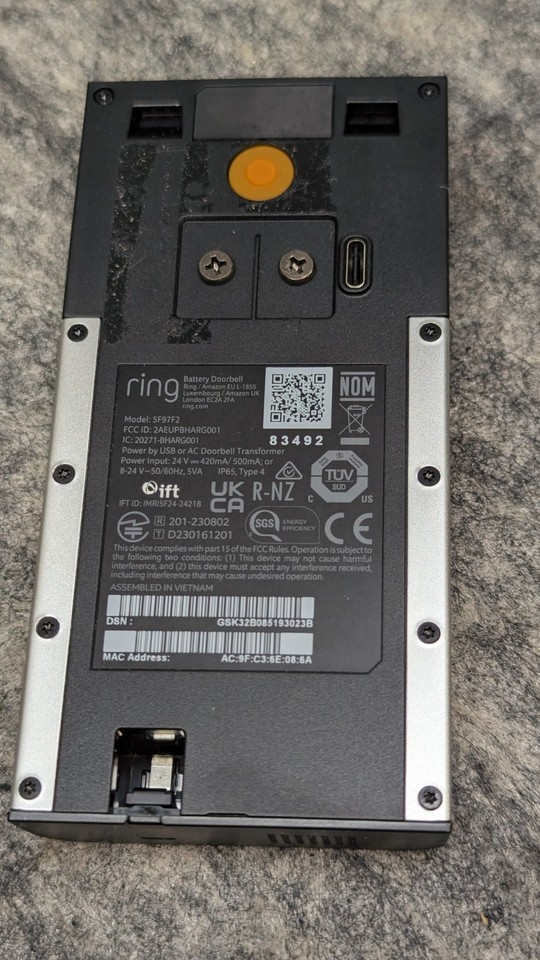 Cleaned and disinfected. Tested and works great with no issues. Minor usage wear as shown in the pictures. Nothing that affects its functionality. Only the doorbell and charging cable are included. No Mount or hardware.