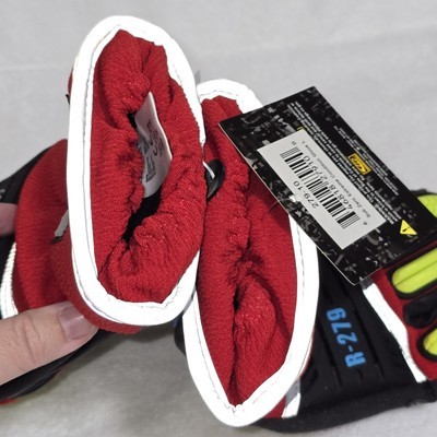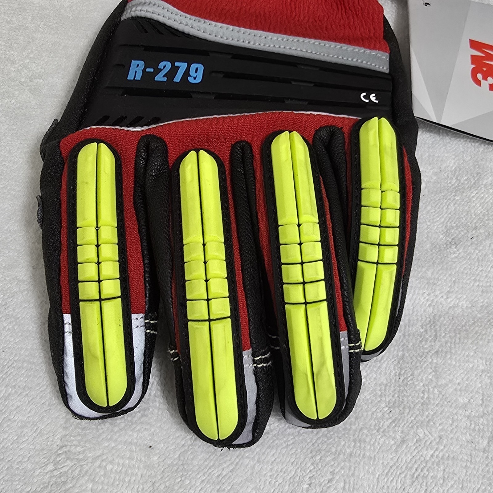 Padded knuckle and palm protection with high-visibility red, yellow blue accents