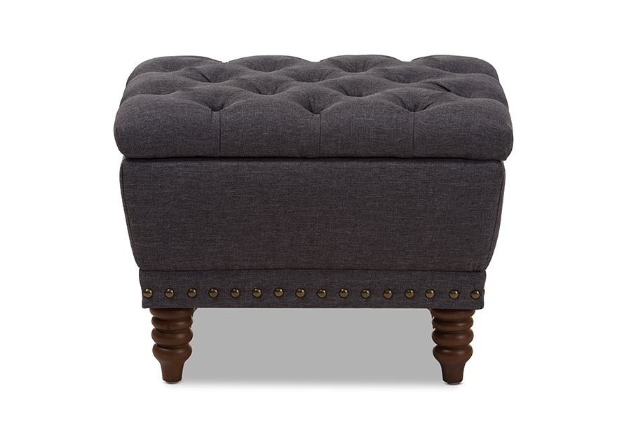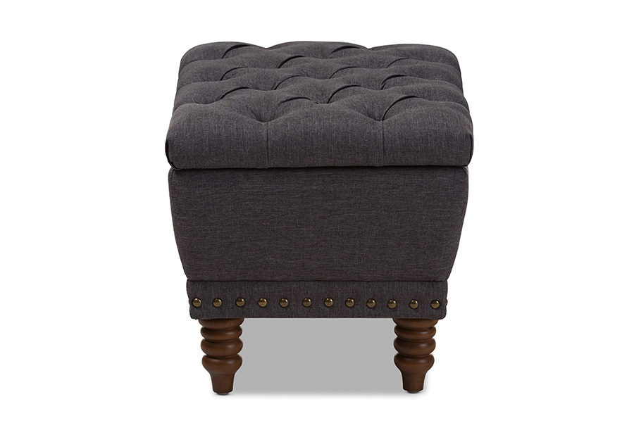 - Riona Dark Gray Fabric, Walnut Wood Finished Button-Tufted Storage Ottoman