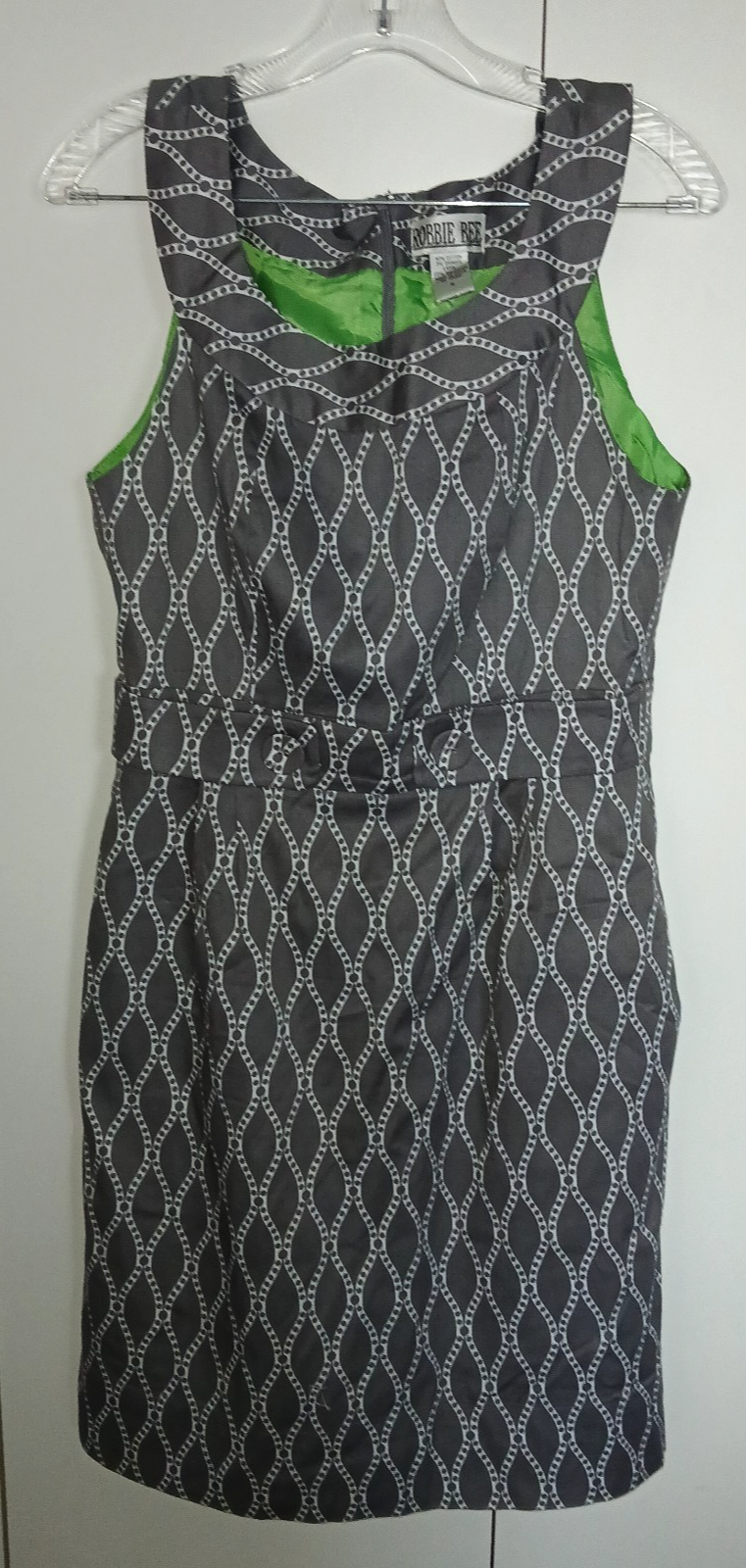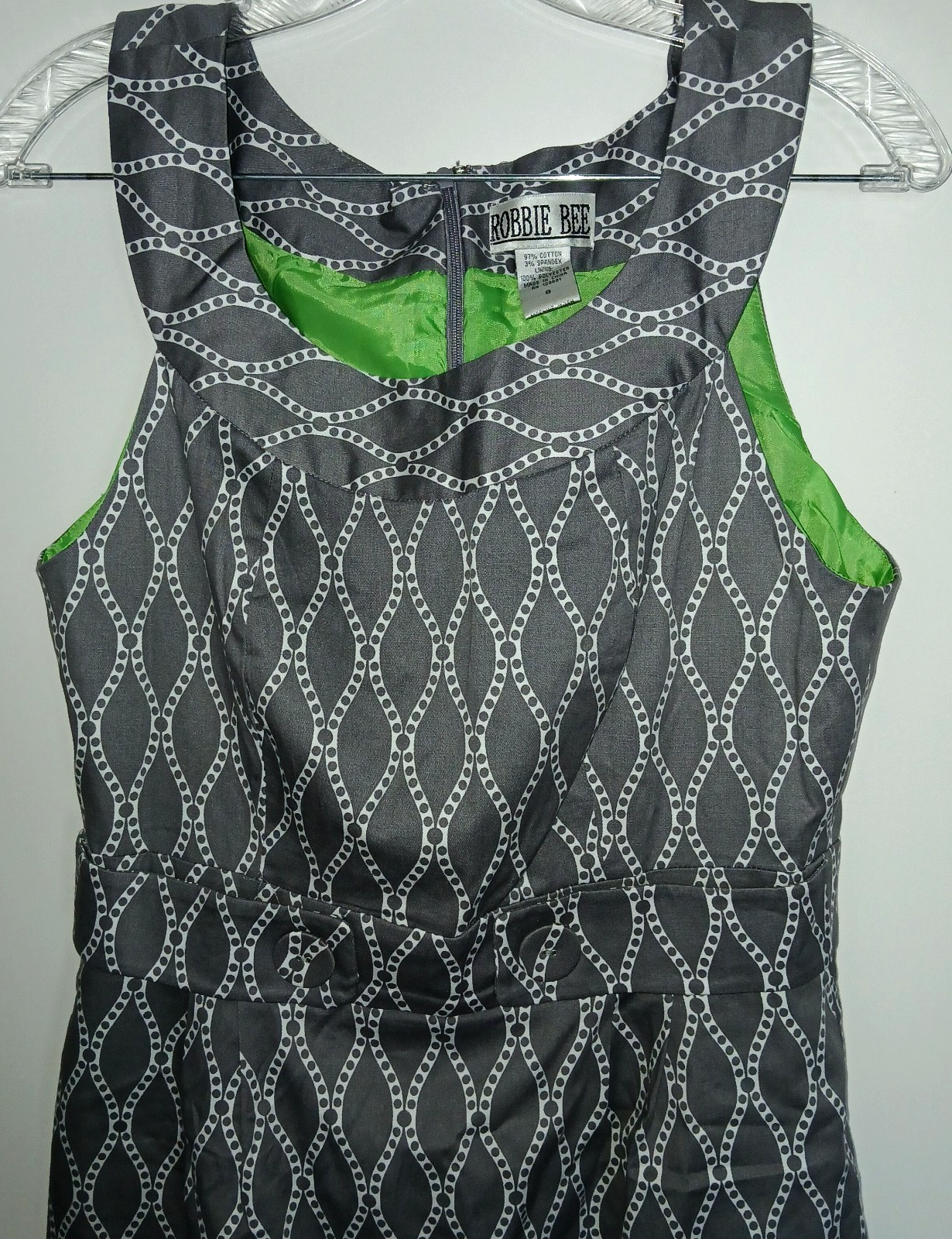 THIS IS A CUTE LADIES ROBBIE BEE SLEEVELESS GRAY WHITE STRETCH LINED DRESS IN A SIZE 8. IT IS NEW, WITHOUT THE TAGS.