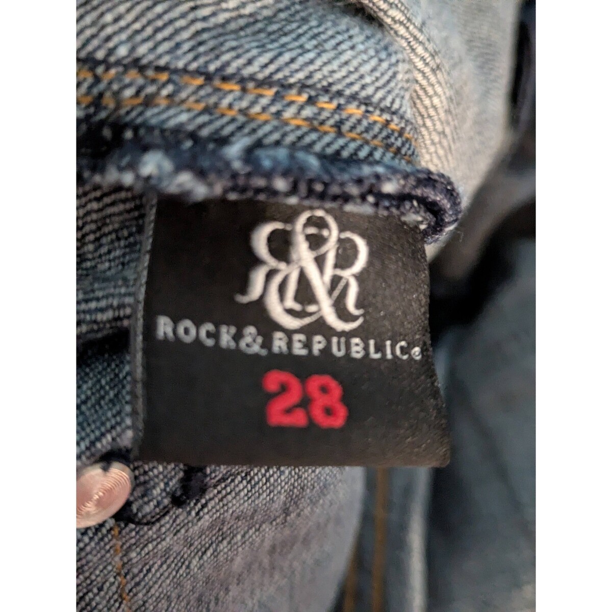 Abraza la estrella de rock que llevas dentro con estos cautivadores jeans acampanados Rock Republic. Confeccionados con una mezcla de primera calidad, estos jeans ofrecen un ajuste favorecedor que acentúa tu silueta con un toque elegante. El detalle desgastado del bolsillo añade un toque de sofisticacion vanguardista, mientras que la clasica bragueta con botones garantiza un cierre seguro y atemporal. Perfectos para canalizar el ícono de la moda que llevas dentro, estos jeans son ideales para un día informal, un concierto o una noche en la ciudad. ? Cintura: 28 pulgadas ? Entrepierna: 31 pulgadas ? Elevacion: 8 pulgadas ? Abertura de pierna: 10 pulgadas Tamaño de cintura: 27 pulgadas Acentos: Boton, Plisado Características: envejecido, bolsillos. Material: algodon, spandex, mezcla de alg