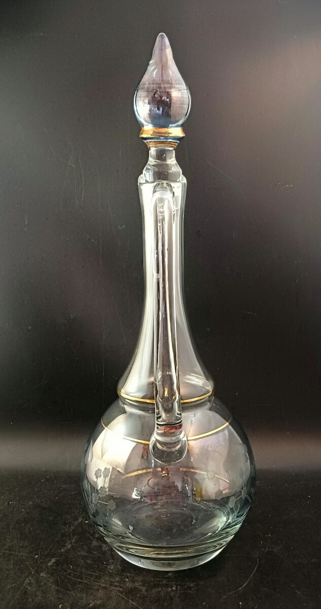 "This Romanian Etched Glass Decanter with Stopper is a beautiful and unique piece of barware, standing at 16.5 inches tall with a 1.5 qt capacity. Handmade with gold accents and featuring a bohemian style, this decanter is perfect for all occasions and would make a stunning addition to any home decor. The intricate leaf pattern and blue color add a touch of elegance, while the stopper ensures a secure closure when not in use. Whether you're a collector or just looking for a stylish piece to add to your kitchen or dining room, this decanter is sure to impress."