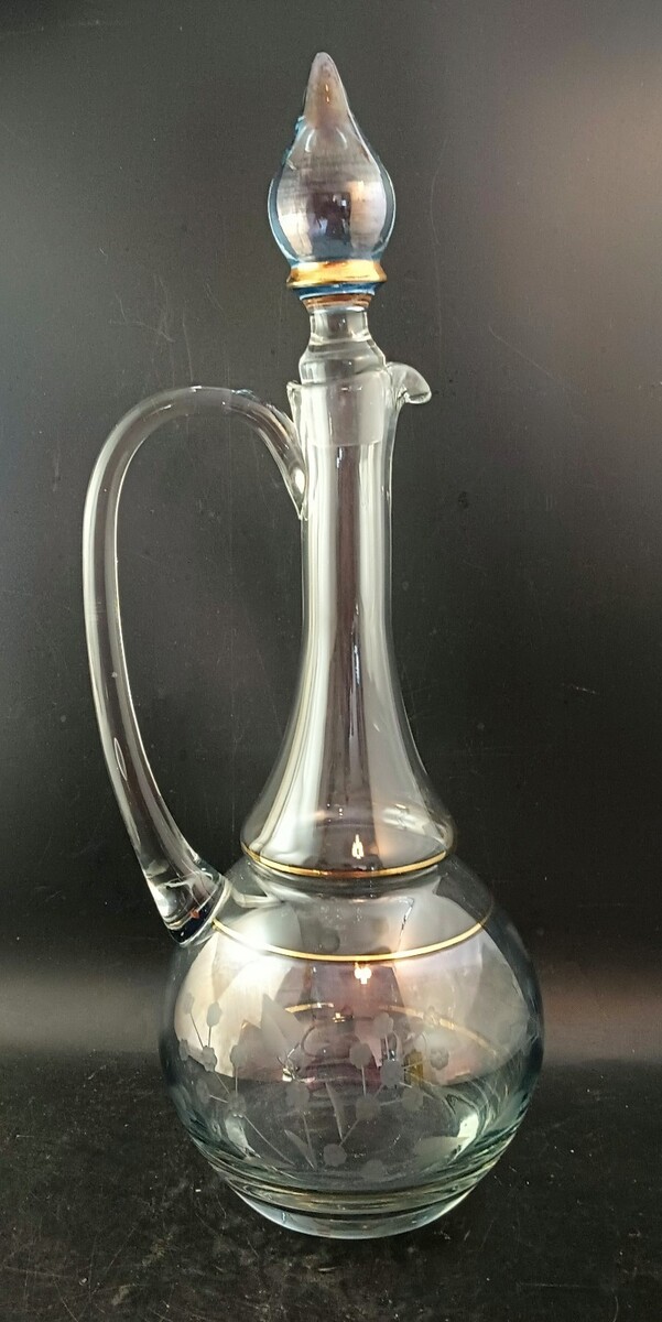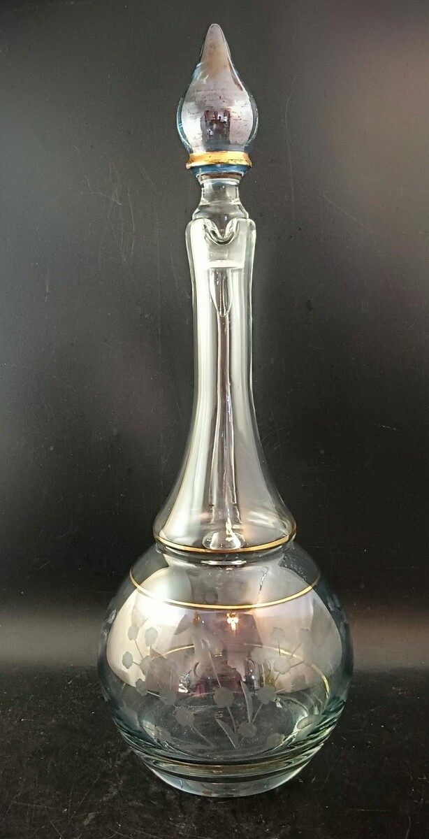 Romanian Etched Glass Decanter With Stopper, Gold Accents 16.5" OBO