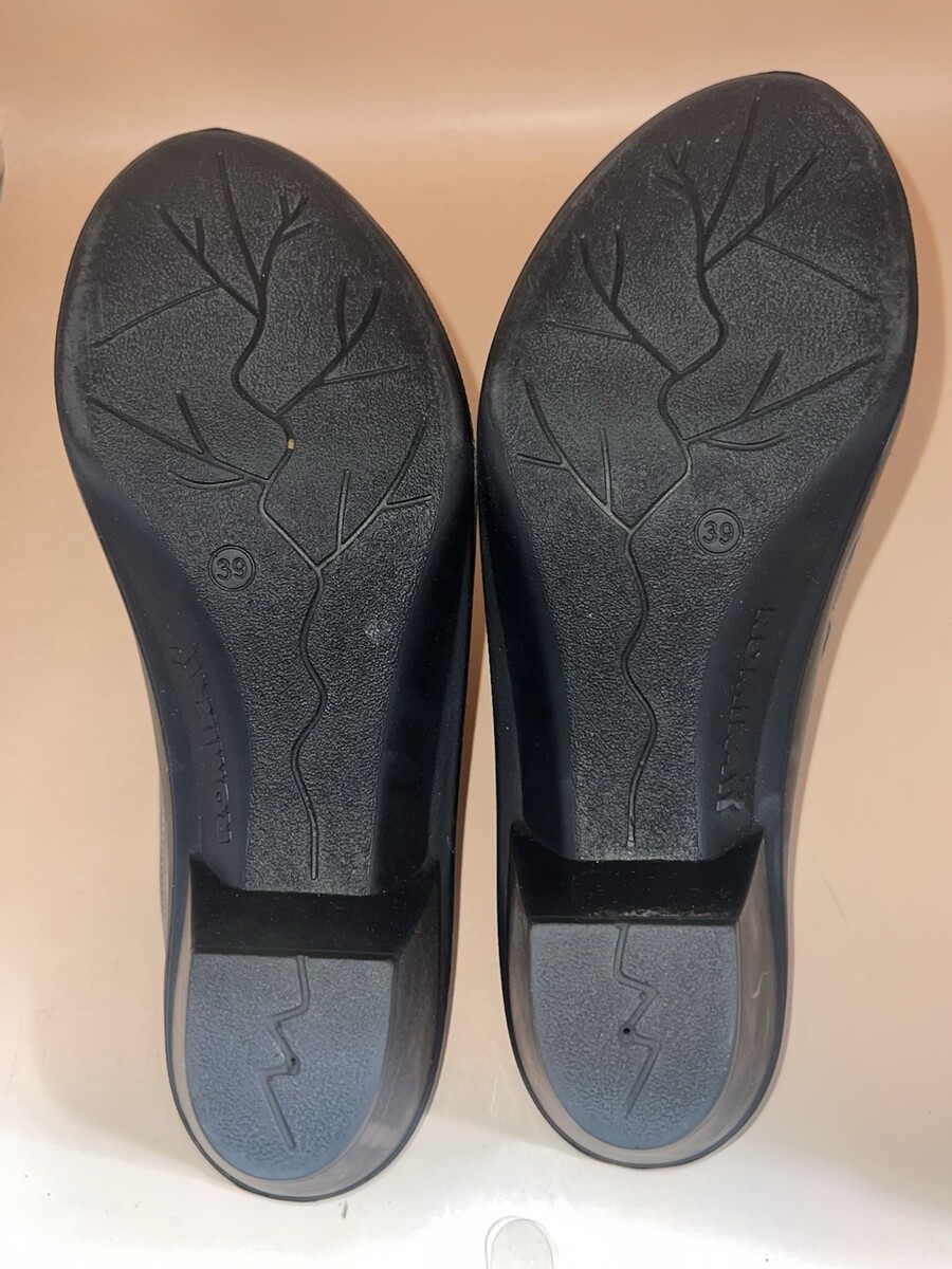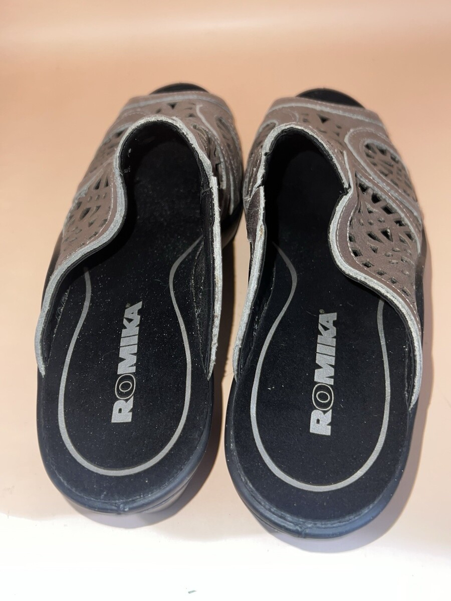 Preowned Romika women?s slide sandals in metallic silver with intricate cutout detailing. These stylish comfort sandals feature a soft footbed, open-toe design, and flexible sole for all-day wear. Romika is known for quality craftsmanship, supportive fit, and lasting durability ? perfect for everyday comfort with a modern look.
