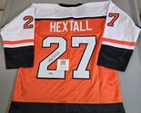 Autographed Philadelphia Flyers Ron Hextall #27 custom hockey jersey, signed in black marker on the back number and authenticated by Beckett (BAS) with matching hologram. High-quality custom fan jersey in Flyers colors with stitched name and numbers. Excellent collectible for Flyers or goalie fans.