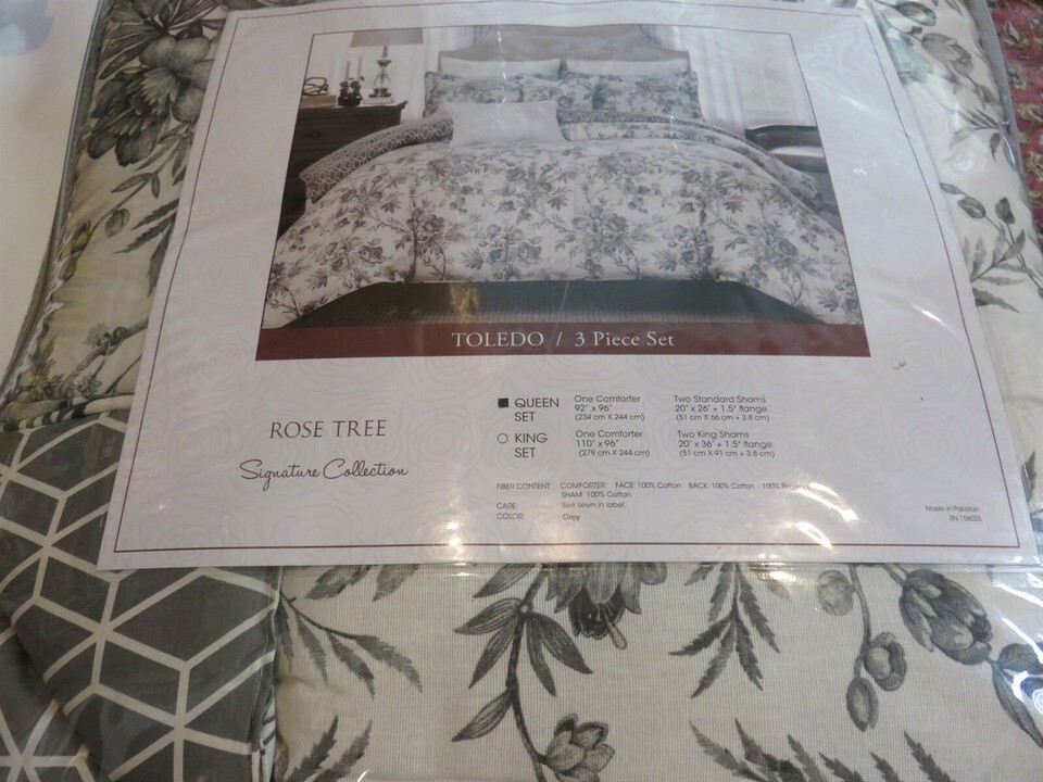 - Rose Tree Signature Toledo 3P Queen comforter shams Jacobean Floral Grey Cream