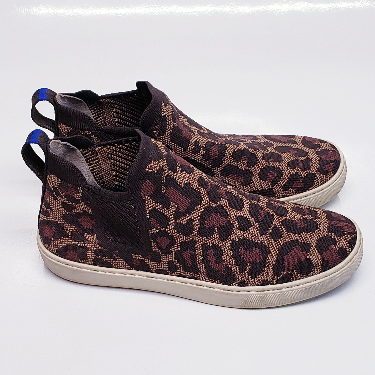 Elevate your shoe game with these stylish and comfortable Rothy's The Chelsea booties! These ankle shoes feature a round toe shape, pull-on closure, and a flat heel style, perfect for everyday casual wear. The brown knit textile upper material is accented with a wildcat / cheetah / leopard animal print, making these boots a bold statement piece.