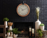 Timeless Rustic Charm Natural wood finish with a glass-covered clock face complements farmhouse, modern, and traditional interiors. Large, Easy-to-Read Display 23.75 diameter ensures clear visibility, making it a functional and stylish focal point in any room. Simple Installation Battery Operated Attached hook for effortless hanging; runs on 1 AA battery (not included) for cord-free convenience. Suitable for indoor use only